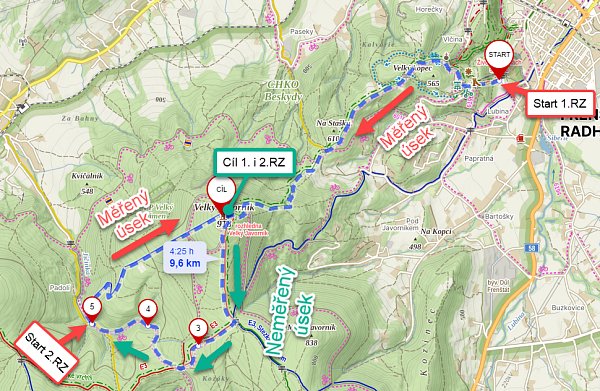 Popis trasy: První rychlostní zkouška probíhá na staré známé trase – start pod můstkem ve Frenštátě pod Radhoštěm, klasické schody a serpentiny až na vrchol. Opakuji až na vrchol! Cíl prvního úseku je pod rozhlednou a ne před chatou, jak jsme zvyklí. Abychom se vyhnuli úzkému hrdlu na schodech kolem chaty, vyznačíme doběh na vrchol širší trasou. Takže před chatou se dáte doleva! Nahoře si pípnete.